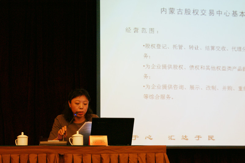 2014年5月11日,由内蒙党委主办的全区文化体制改革和产业发展培训班在内蒙古呼和浩特维力斯大酒店会议楼正式开班。我中心副总经理孙枫应邀做了题为《内蒙古股权交易市场服务于我区文化体制改革和产业发展的市场化平台》的讲座。