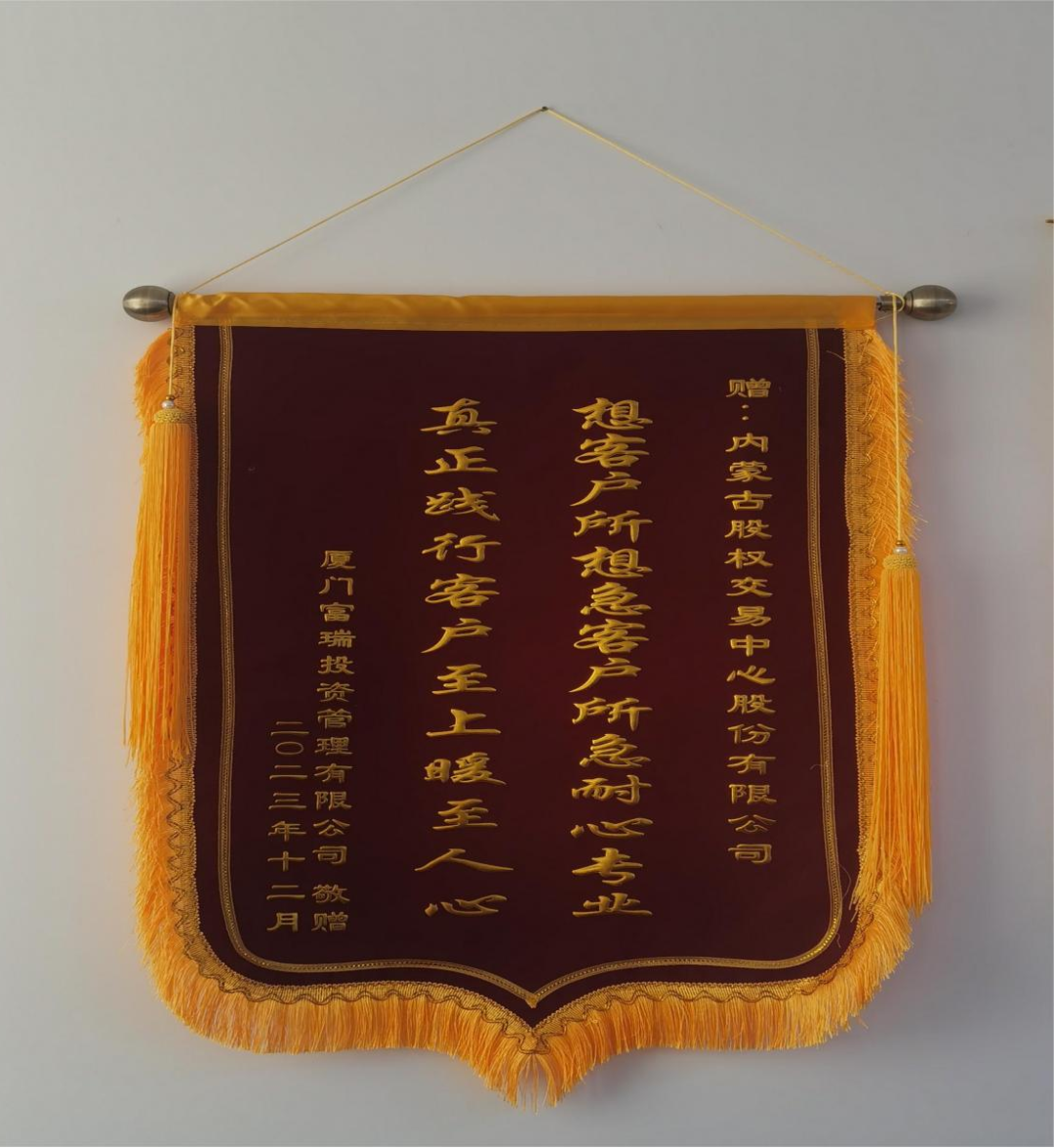 12月18日、25日,内蒙古股权交易中心股权登记托管分别收到客户托管银行股东厦门鹭升物流有限公司、厦门富瑞投资管理有限公司的锦旗,此前股交中心登记托管业务经办人员多次为客户代办工商质(解)押业务,在业务办理过程中耐心细致解答各项疑问的同时,深入帮助对接工商部门一站式办理质押登记,不仅提高了效率,而且为外地股东节省了成本,确保及时通过股权质押获得融资。为此,客户送来“以客户为中心、以服务树信誉”“想客户所想急客户所急耐心专业、真正践行客户至上暖至人心”的38个金色大字锦旗,表达对股交中心股权登记托管的仔细工作、持之以恒的敬业精神给予充分肯定。
