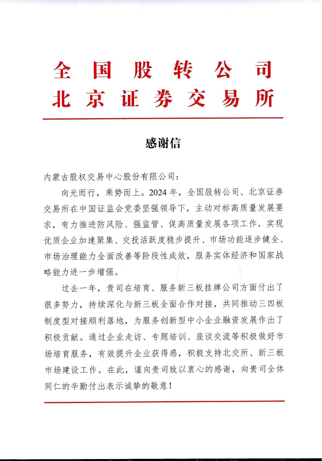 近日,内蒙古股权交易中心收到北京证券交易所、全国股转公司的感谢信,对内股交过去一年在培育和服务创新型中小企业方面的积极贡献表示高度评价与感谢。