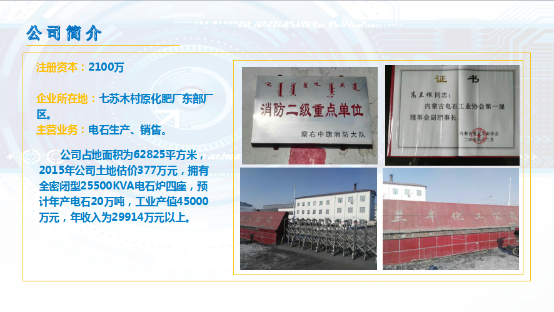 “察右中旗兰丰化工有限责任公司”2007年响应政府号召在察右中旗原化肥厂建设乌兰察布地区第一家新型全密闭电石炉,现阶段与唐山三友集团密切合作,是当地一家优质的电石生产企业。随着近些年的经济下行,电石行业也不同程度的受到了一定的冲击。然而兰丰化工依靠优质的产品供应、稳定的上下游供销关系和稳健的生产策略,在经济下行阶段行业普遍受到冲击的情况下依旧平稳发展,是乌兰察布当地优质的电石企业。