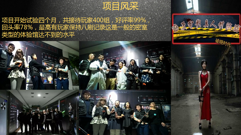 项目简介:破晓时代动漫电影真人体验馆是一种实景体验真人扮演的体验式娱乐项目,属于电影动漫等文化形式的周边衍生品,并且基于文化主体进行二次创作和深度开发,拥有自主知识产权,结合ARVR等科技将形成新的文化主体。该娱乐模式结合了密室逃脱,鬼屋,真人CS,桌游等当红体验式娱乐的优点,并且拥有互动性高,代入感强,重复消费次数多,基础设施投入少等战略优点。