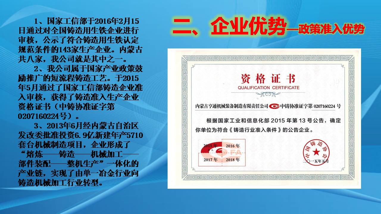 *公司属于国家产业政策鼓励推广的短流程铸造工艺,并通过了国家工信部铸造企业准入审核,获得了铸造准入生产企业资格证书。