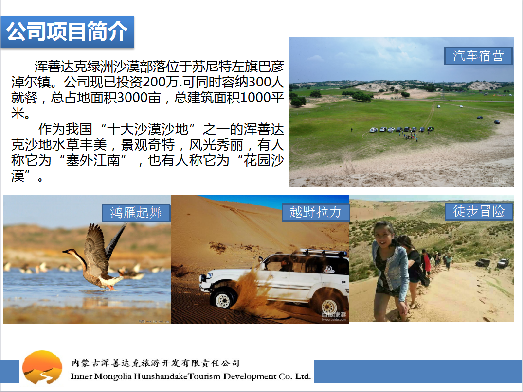 *内蒙古浑善达克旅游开发有限责任公司致力于打造集沙地、草原、湿地及浓郁的蒙古风情为一体的浑善达克绿洲沙漠部落,并使之成为锡林郭勒盟地区乃至全区、全国具有独特影响的优质旅游品牌景区。