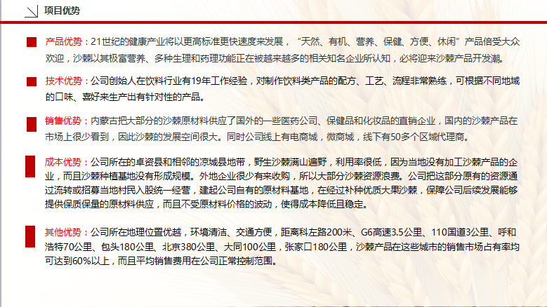 * 21世纪的健康产业将以更高标准更快速度来发展,“天然、有机、营养、保健、方便、休闲”产品倍受大众欢迎,沙棘以其极富营养、多种生理和药理功能正在被越来越多的相关知名企业所认知,必将迎来沙棘产品开发潮。