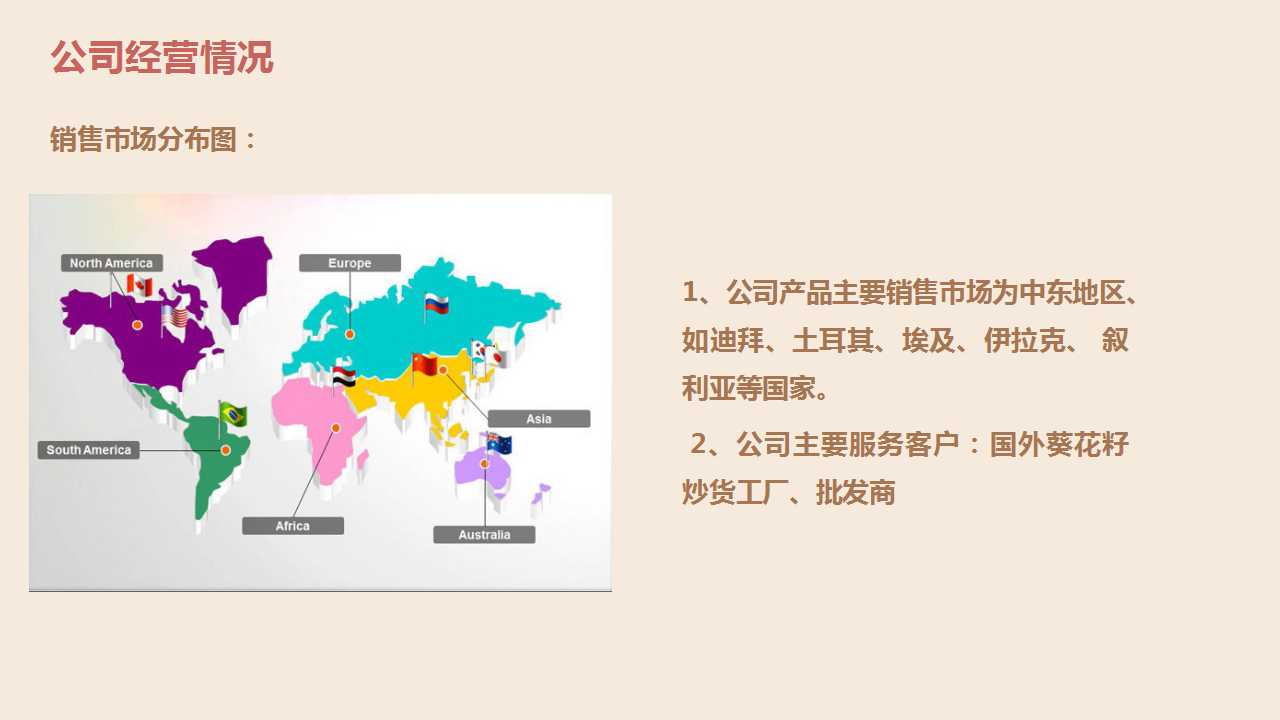 *公司董事长拥有23年葵花籽海外销售经验,每年多次深入走访国外市场,紧抓市场动态和走向趋势。