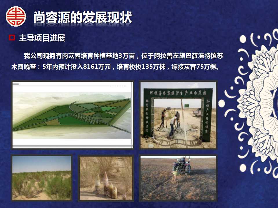 公司坐落于“苍天圣地”阿拉善,拥有数万亩沙漠珍稀中药材采集基地,是世界珍稀的肉苁蓉、锁阳等沙漠原生态珍稀植物的原产地核心区