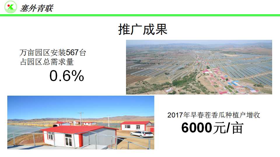 *万亩园区安装567台,占园区总需求量0.6%;2017年早春茬香瓜种植户增收6000元/亩。