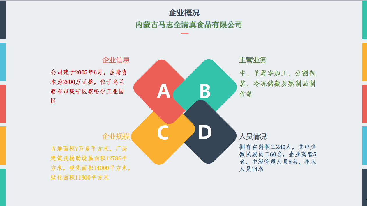 内蒙古马志全清真食品有限公司(简称:马志全食品)成立于2005年,主营业务牛、羊屠宰加工、分割冷藏及熟制品为一体的清真食品肉类联合加工等。主要销往北京、上海、南京、青岛等三十多个大中城市及香港和中东阿拉伯国家。