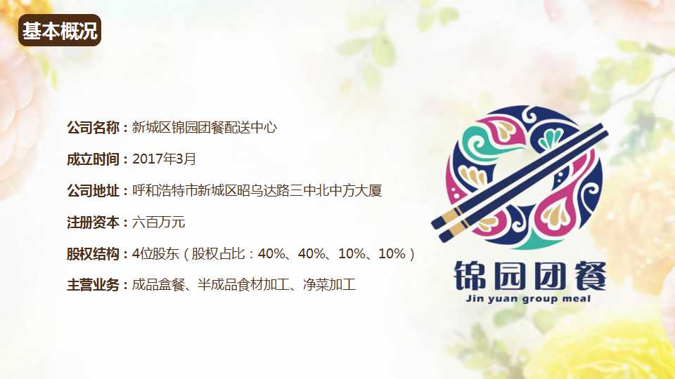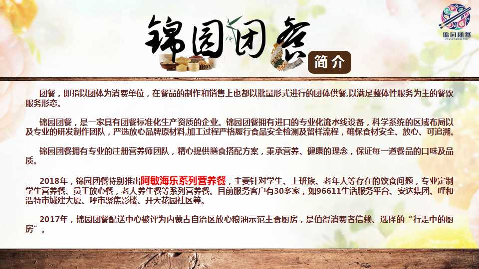 *锦园团餐拥有呼和浩特地区80%的社区物业资源,月生产量已达23000份,毛利率占60%。2018年,推出的阿敏海乐系列营养餐,为96611生活服务平台、安达集团、呼和浩特市城建大厦、开天花园社区等单位进行配送。