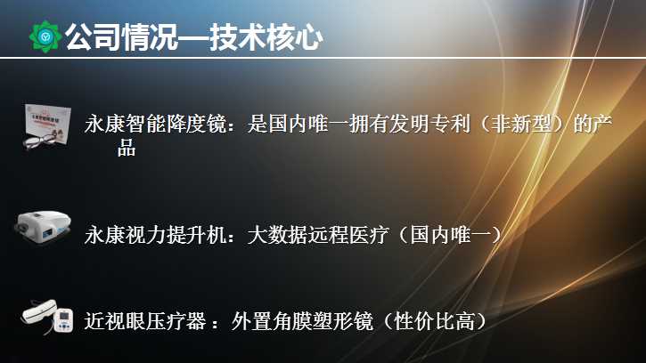 *围绕独创"青少年近视自然综合疗法"理念,研发以"永康智能降度镜"为主的系列产品,获得了多项国家知识产权。