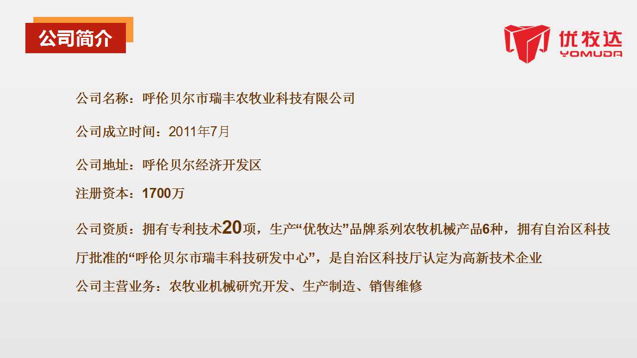 ·公司拥有专利技术20项,“呼伦贝尔市瑞丰科技研发中心”已通过自治区科技厅批准认定“优牧达”系列牧草机械荣获2016年全国“精耕杯”——“用户最心仪的饲料收获机械十佳品牌”,具有技术领先、结构坚固、工作效率高等特点,品牌其技术水平在呼伦贝尔地区同行业处于先进水平。