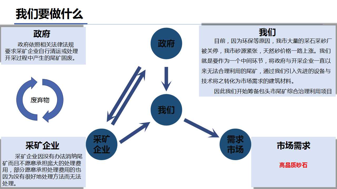 该项目致力于消纳包头市多年来所产生的数亿吨废弃尾矿,以尾矿石作为原材料进行建筑材料的生产加工,主要产品为机制砂,同时,在生产过程中产生附属产品石粉。