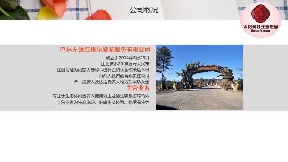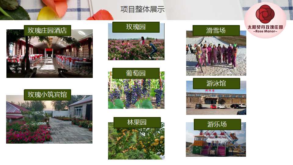 ·庄园包含玫瑰园、葡萄园、林果园、玫瑰庄园酒店、玫瑰小筑宾馆、游泳馆、垂钓园、游乐场、滑草/滑雪场、苗木基地等,建成区占地面积780亩,建筑面积1200平方米,已完成总投资2800万元