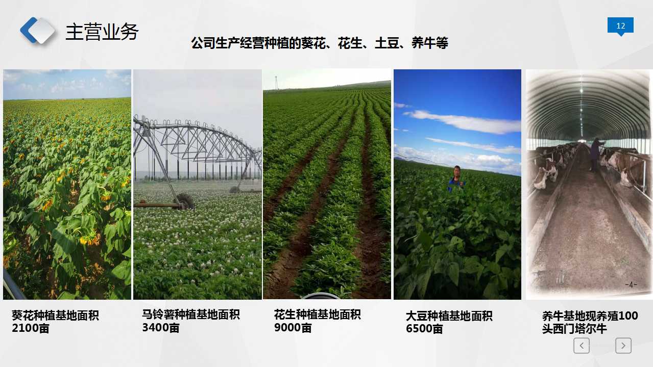 ·公司种植基地在兴安盟科尔沁右翼中旗高力板镇赛罕塔拉嘎查,凭借着得天独厚的绿色无污染的自然环境和优良品种,主要种养殖有葵花、花生、马铃薯、大豆、养牛等产品主要销往国内市场。