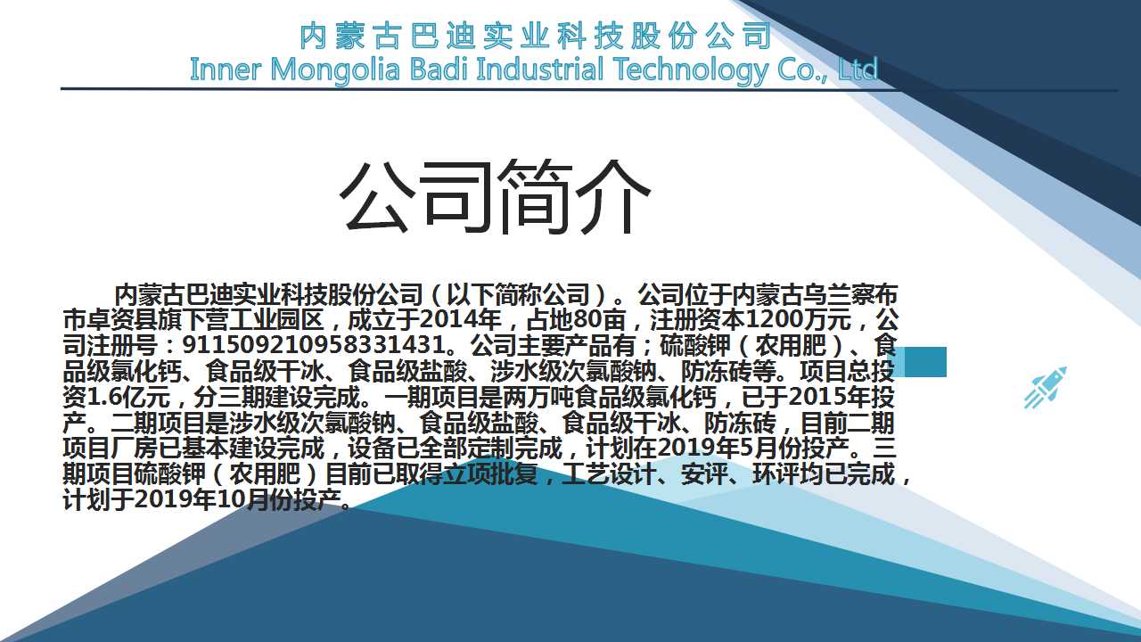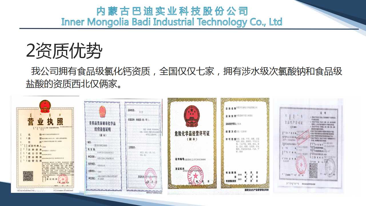 *公司具有食品级氯化钙、涉水级次氯酸钠、食品级盐酸生产经营资质及两项循环经济产业链,真正实现了企业废弃物循环再利用。
