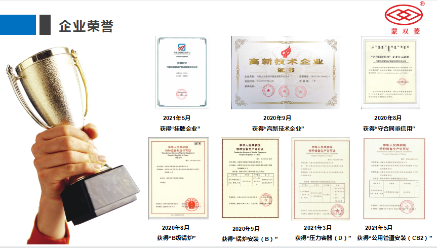 1、内蒙古双菱锅炉制造有限责任公司为高新技术企业、国家B级锅炉制造、B级锅炉安装、D级压力容器设计与制造、GB2热力管道安装、ISO体系认证、并拥有内蒙古著名商标的大中型锅炉制造商。公司拥有15项产品研发专利,具有丰富的研发、生产经验。